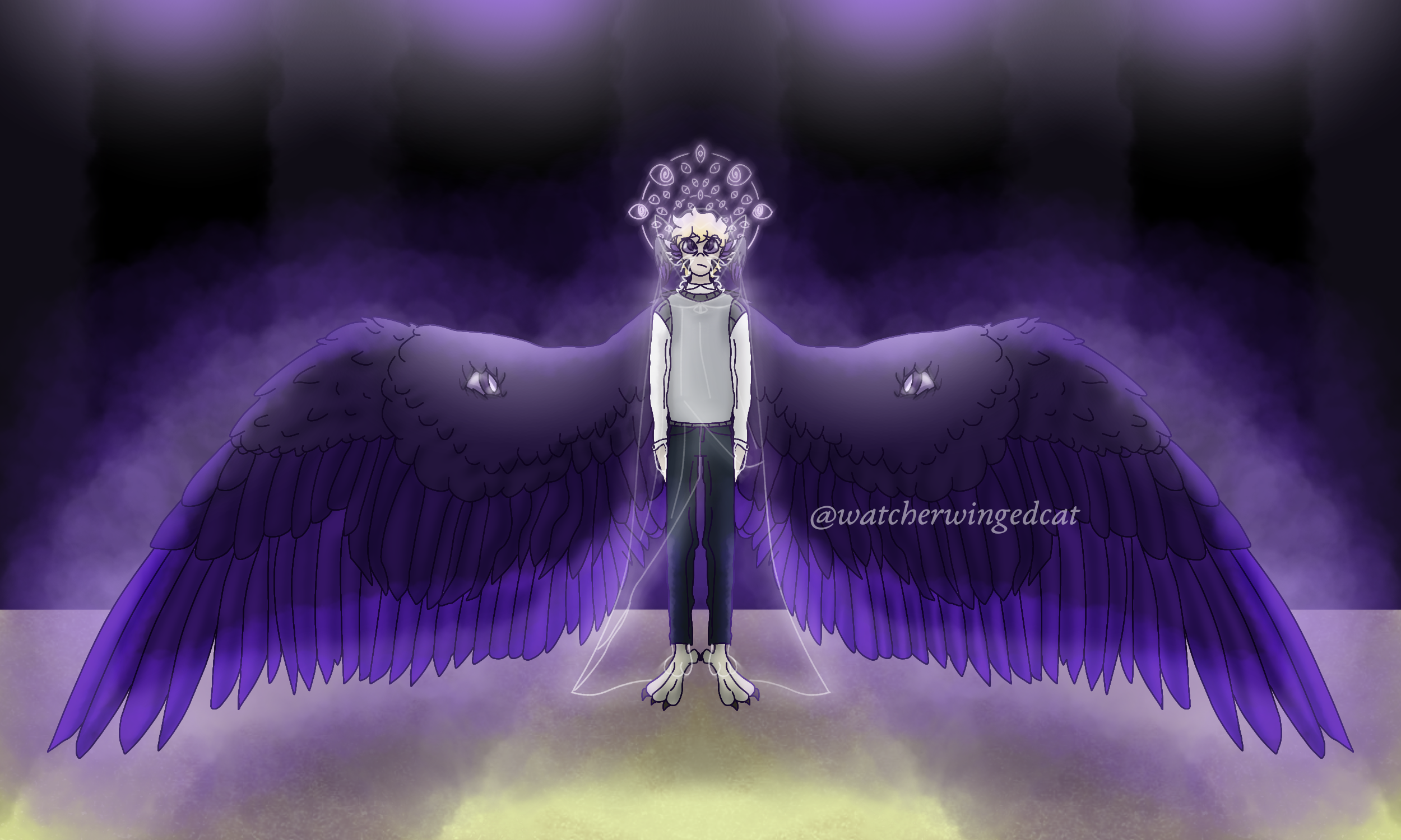 I'm physically a Watcher, which means my body is not human at all. I believe my body is the one of a Watcher, my mind is the one of a dog and my soul is the one of a winged cat. I'm also a jackrabbit and a barn owl. But, what are Watchers? Watchers are beings that are made of the matter of the universe. Internally, they dont have organs, bones, or concrete form. They're made of energy that shows itself in the form of eyes. By analyzing its body, its made of star, dust, darkness... That is to say, they are made of the universe. They take the form of eyes and wings to fulfil its duties more easily. They can change form to whatever they please, but this takes energy.